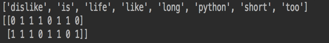 ['dislike', 'is', 'life', 'like', 'long', 'python', 'short', 'too']文本特征抽取的结果: