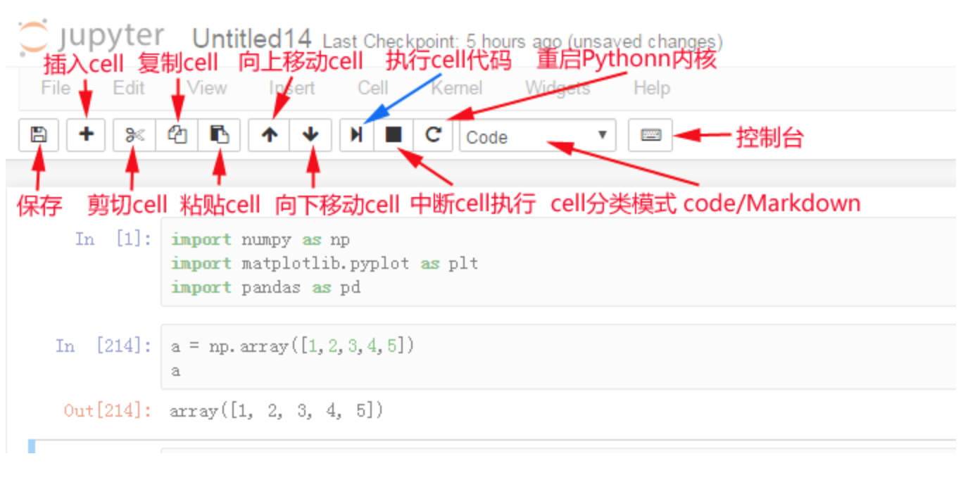 Y,cell 切换到 Code 模式M,cell 切换到 Markdown 模式A,在当前 cell 的上面添加 cellB,在当前 cell 的下面添加 cell- 其他(了解)