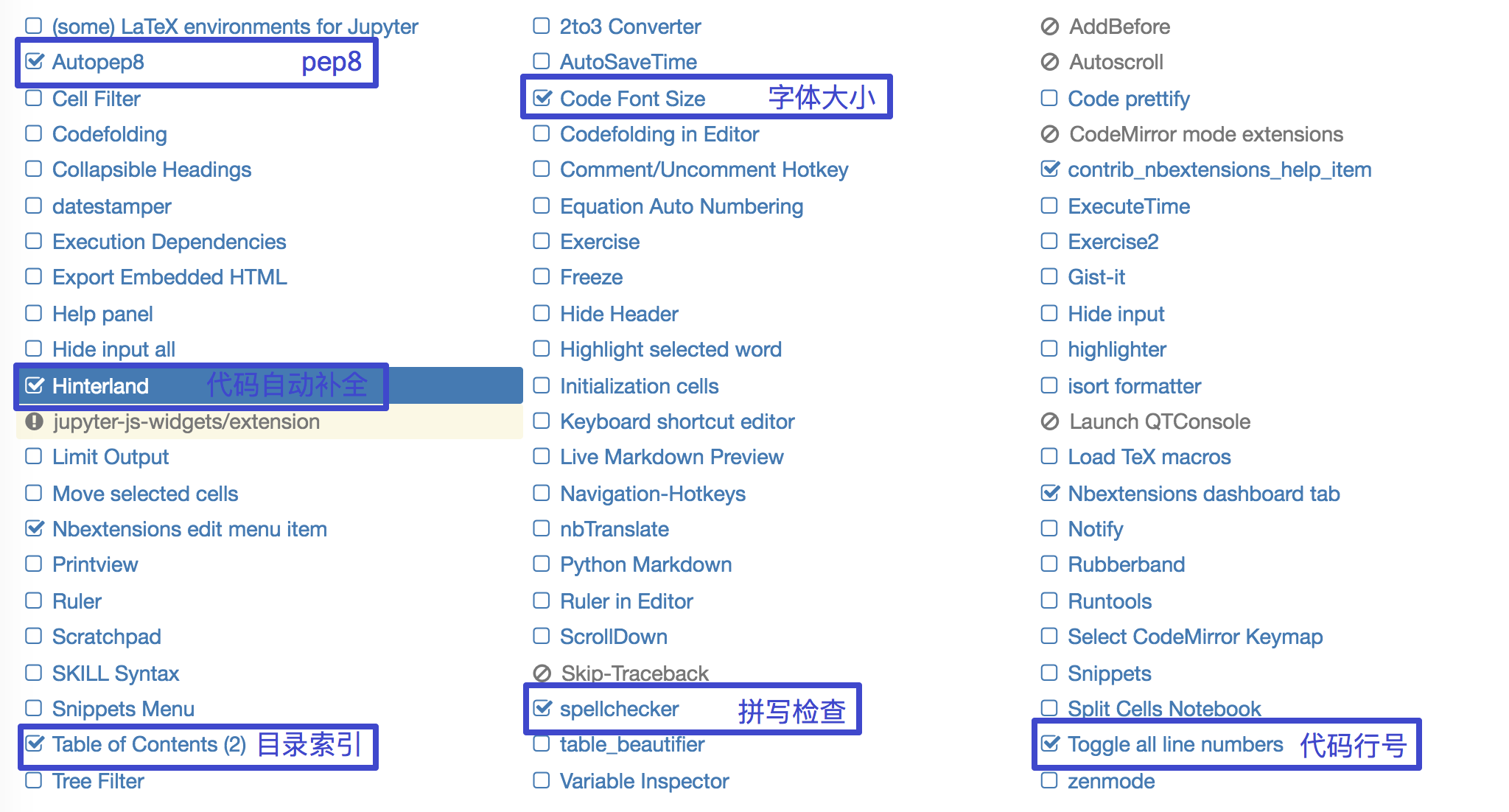 jupyter contrib nbextension install --user --skip-running-checkjupyter contrib nbextension install --user --skip-running-check在原来的基础上勾选: “Table of Contents” 以及 “Hinterland”
