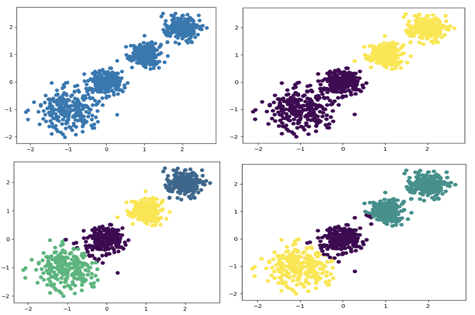 随机创建不同二维数据集作为训练集,并结合k-means算法将其聚类,你可以尝试分别聚类不同数量的簇,并观察聚类效果:
