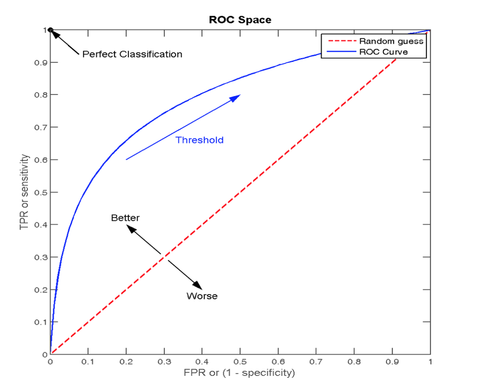 - AUC=1,完美分类器,采用这个预测模型时,不管设定什么阈值都能得出完美预测。绝大多数预测的场合,不存在完美分类器。
