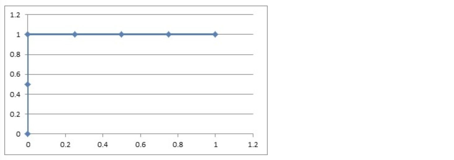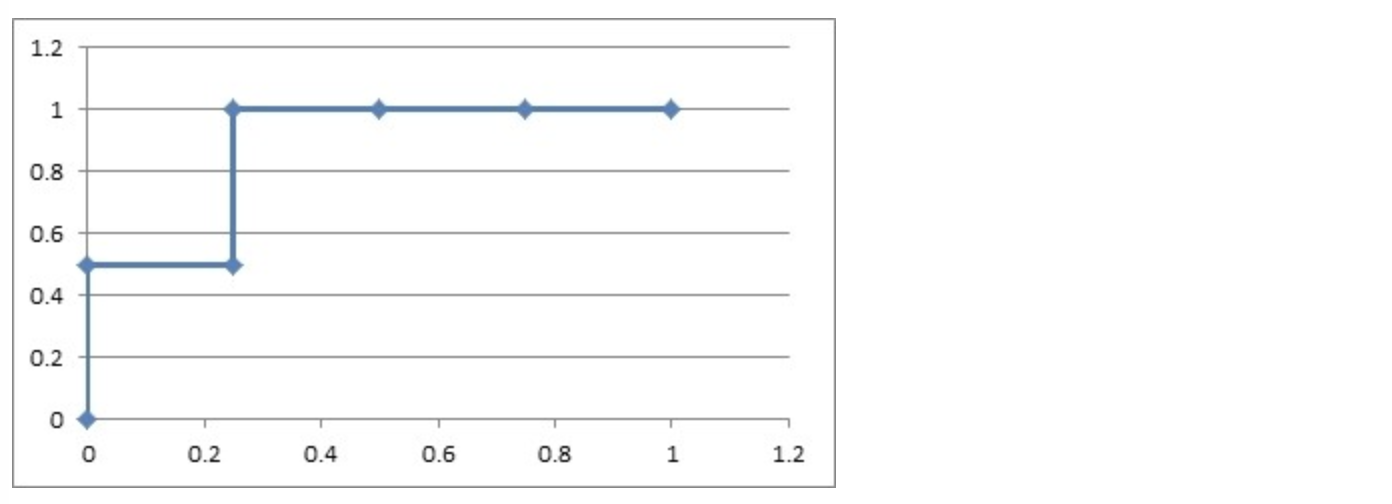 4)再从最大开始取一个点作为正类,取到点2,计算得到TPR=1.0,FPR=0.25;