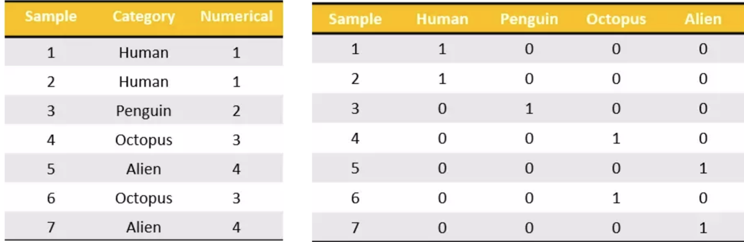 把每个类别生成一个布尔列,这些列中只有一列可以为这个样本取值为 1.其又被称为热编码。