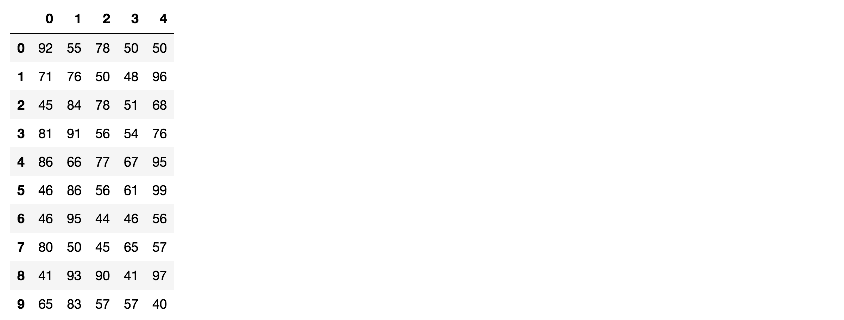 [65, 83, 57, 57, 40]])# 生成10名同学,5门功课的数据